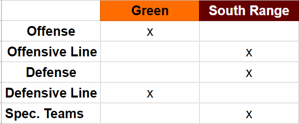*Note: It is of my belief that the reason for the Raiders’ success offensively is due to their defensive prowess. Hence why I believe Green’s offense has the slight edge over South Range.